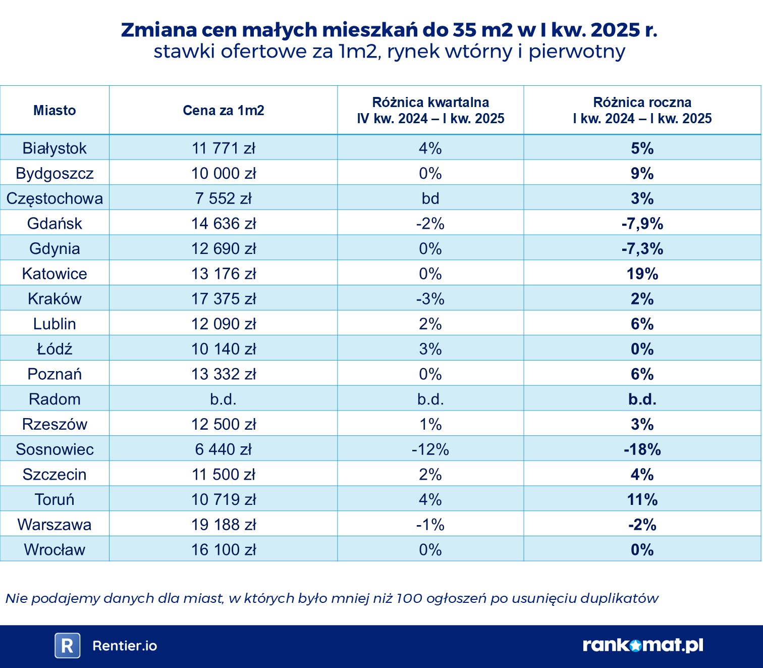 Powyższa analiza dotyczy mieszkań występujących w ogłoszeniach internetowych serwisu Rentier.io z okresu od 1 stycznia do 31 marca 2025 r. dla 17 miast. Wyliczenia sporządzono na podstawie ogłoszeń sprzedażowych z uwzględnieniem stawek ofertowych łącznie na rynku pierwotnym i wtórnym. Publikujemy wyniki tylko, gdy liczba ogłoszeń jest nie mniejsza niż 100.